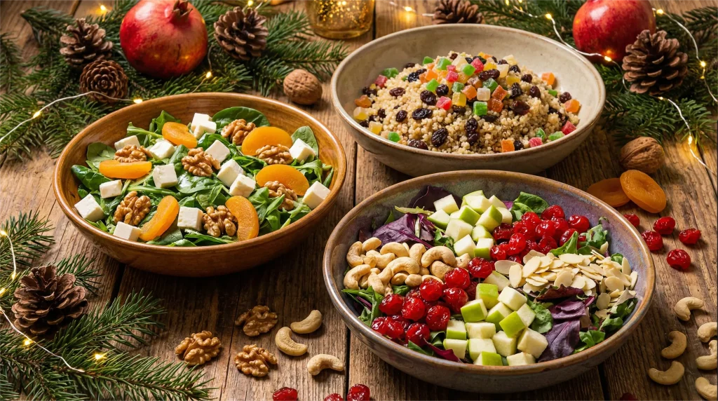 Descubra 3 receitas de salada natalina saudável com ingredientes como nozes, damasco, azeite e folhas frescas. Surpreenda na ceia com sabor e nutrição!